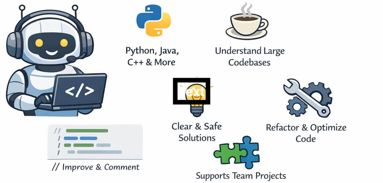 Claude Code is an AI assistant focused on programming and software development tasks. Unlike basic code generators, it emphasises clarity, safety, and structured reasoning. It can work with multiple programming languages such as Python, Java, C, C++, JavaScript, and web technologies. Claude Code is particularly good at understanding large codebases, explaining logic in simple terms, and suggesting improvements without blindly copying solutions.